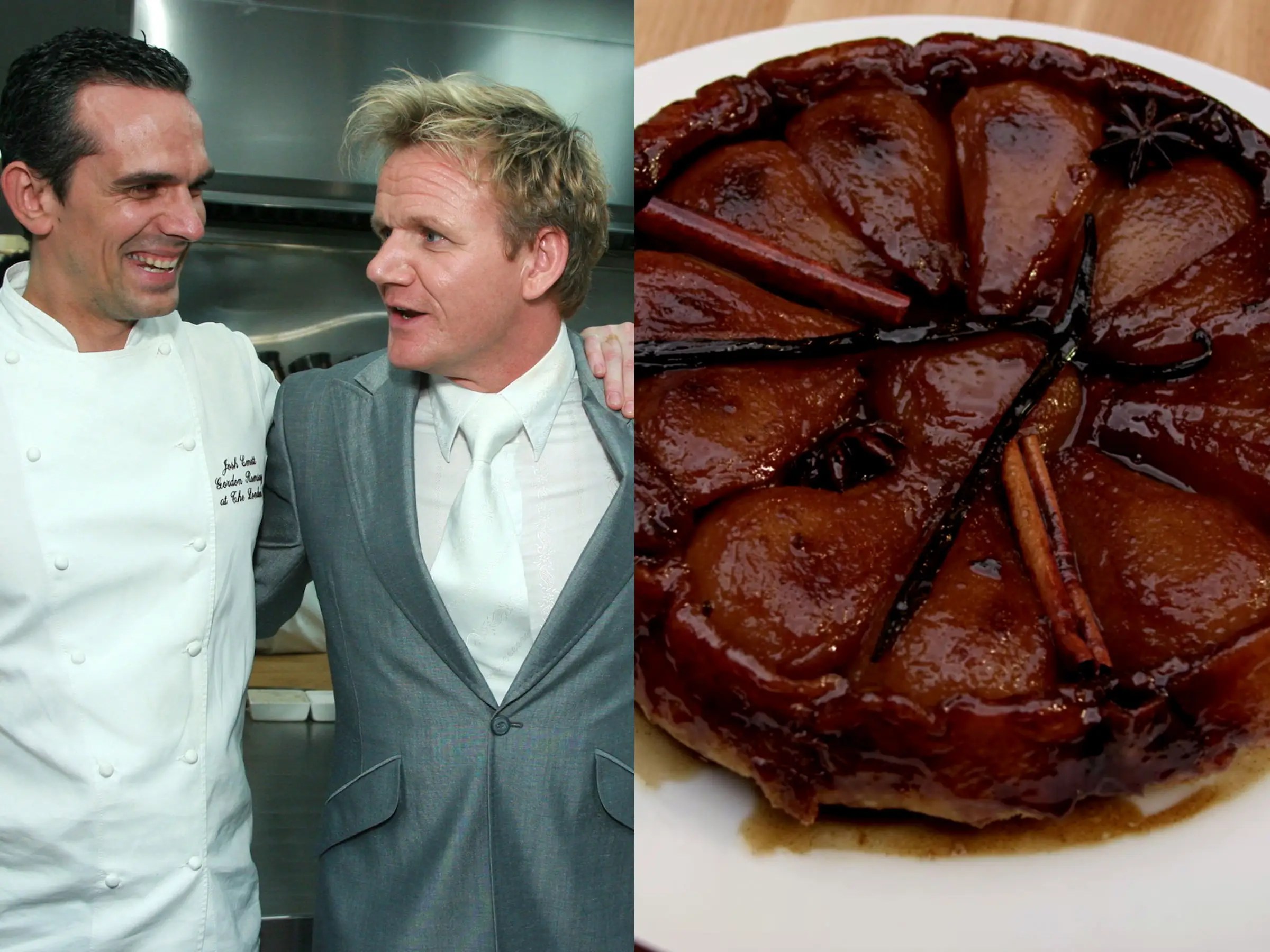 Tarte tatin is a classic French dessert, essentially an upside-down pie. Pears are caramelized in a sugar-butter mixture in an oven-safe skillet, covered with crust, and baked in the oven.Ingredients | Apple Tarte Tatin Recipe Gordon Ramsay1 (15 ounce) package ready-to-use refrigerated pie crust⅛ teaspoon ground nutmeg½ teaspoon ground ginger2 tablespoons white sugar5 firm pears2 tablespoons good quality bourbon whiskey4 tablespoons unsalted butter⅔ cup white sugar1 pinch saltDirectionsRemove refrigerated pie crust from package, and follow manufacturer's suggestions for unrolling crust. Set aside.Combine nutmeg, ginger, and 2 tablespoons sugar in a small bowl.Peel, quarter, and core 4 pears. Slice each quarter into 3 slices, from core end to bottom, and place in a large bowl. Cut remaining pear in half; peel, and core one half and add to the bowl. Peel, core, and slice the other half as directed above and add to the bowl. Drizzle pears with bourbon and sprinkle with spice-sugar mix, tossing to evenly coat.Melt butter in a 9-inch cast-iron skillet over medium heat. Add 2/3 cup white sugar and salt to the melted butter, stirring to combine until mixture bubbles, 2 to 3 minutes. Place the single pear half in the center of the skillet. Fan remaining pear slices around the center, core end to the outside of the skillet and stem end toward the center. If possible, turn the pieces in the same direction. Keep adding pear slices, filling in any gaps, until they are all in the skillet.Reduce heat to medium-low. Cook, undisturbed, until pears are fork-tender and color develops to the liquid, about 20 minutes.Preheat the oven to 375 degrees F (190 degrees C). Place a baking sheet on a rack in the lower third of the oven.Remove skillet from heat and place unbaked pie shell on top of the fruit, using a fork to tuck the edges of the pie shell toward the bottom of the skillet. Place skillet on the prepared baking sheet in the preheated oven. Reduce temperature to 350 degrees F (175 degrees C).Bake until crust is brown, 28 to 30 minutes. Remove from oven. Place a heat-safe plate, larger than the skillet, upside down over the crust.Use oven mitts to grab the plate and skillet together and quickly flip the skillet contents onto the plate; this move is tricky and requires some forearm strength and dexterity. After the flip, if the contents are not centered on the plate, use a spatula to gently move to the center. Add any fruit that remained in the skillet, and drizzle any remaining liquid over the top of the tarte tatin.Allow to sit 15-20 minutes, then serve warm.Info | Apple Tarte Tatin Recipe Gordon Ramsayprep: 20 mins cook: 50 mins additional: 15 mins total: 1 hr 25 mins Servings: 8 Yield: 8 servings
